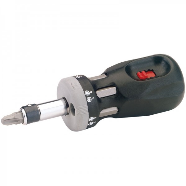 Forward and reverse with locking action, 1/4” bit holder and six double-ended bits. Multiples of 24 sets only, Supplied in countertop display.