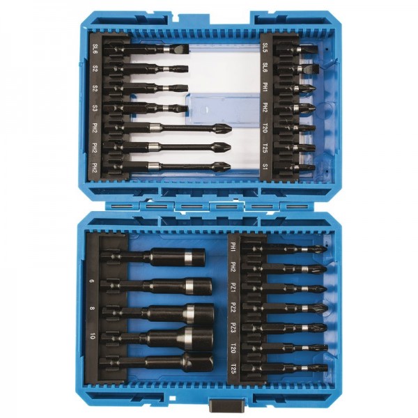 Expert Quality, 1/4” hex impact screwdriver bit set, manufactured from S2 steel, correctly hardened and tempered with a phosphate finish. Designed for use with impact drivers. Supplied in a plastic case with soft grip detail.