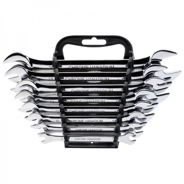 Expert Quality, forged from chrome vanadium steel hardened, tempered, chrome plated and fully polished. Open ends set at 15°. Supplied on wall mountable plastic rack.
