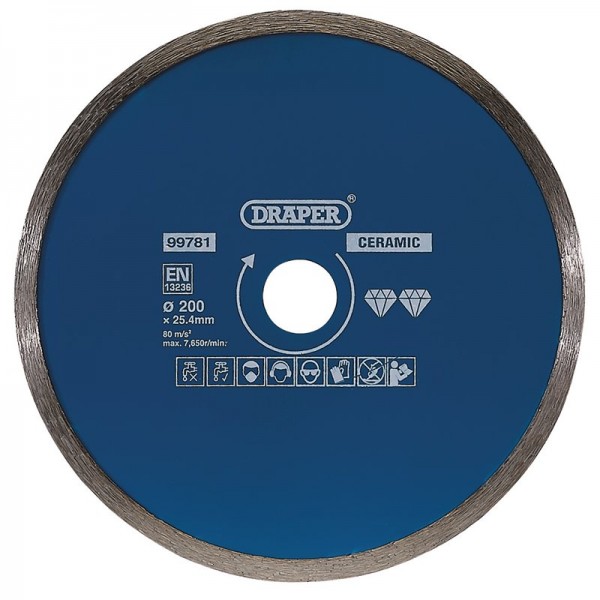 Hardened and tempered diamond blade with continuous rim to provide a smooth cutting finish. Designed for use on ceramic and natural stone tiles. Suitable for dry and wet cutting, with optimum results when used wet. Compatible with most tile cutting machines with a 25.40mm bore.