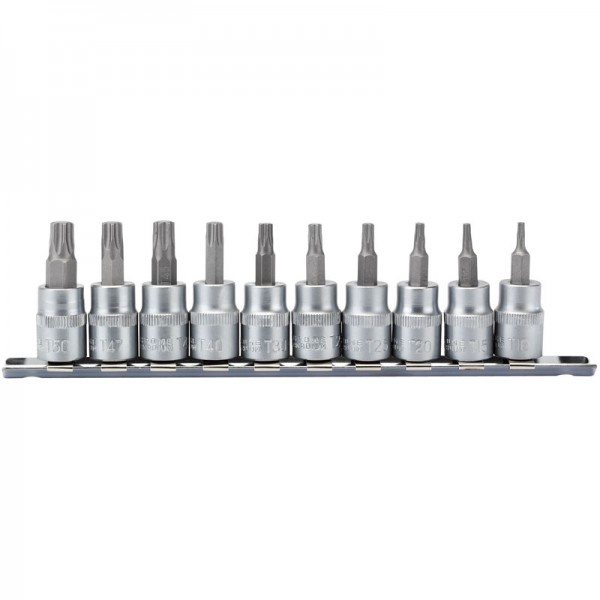 Expert Quality, 10 Draper TX - STAR® Plus socket bits, 48mm long. All socket manufactured from hardened and tempered chrome vanadium steel with sand blasted bits of S2 silicon steel. Each socket has a knurled ring for extra grip. Supplied on a steel socket retaining rail.
